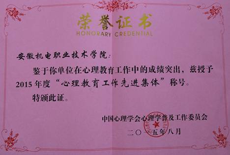 本次会议由中国心理学会心理学普及工作委员会、安徽省心理学会、安徽省心理咨询师协会共同主办。会上表彰了一批心理教育工作先进集体和个人,公布了安徽省心理学学术大会论文评选结果。我院喜获2015年度全国“心理教育工作先进集体”荣誉称号,大学生心理健康教育中心王东华老师荣获2015年度全国“心理教育工作先进个人”称号,王东华老师提交的论文获得了一等奖。